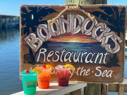 Equal parts laid‑back hangout and local legend, Boondocks channels the easy rhythm of life on the water. Picnic‑table dining spills onto the pier, where the day’s catch hits the grill beside juicy smash burgers, peel‑and‑eat shrimp, and Gulf‑inspired specials. Ice‑cold craft brews, frozen cocktails, and live acoustic sets keep the vibes breezy from sunny afternoons through fire‑lit evenings. Whether you drop anchor for a quick bite or linger over cornhole and sunset tunes, Boondocks is the barefoot‑friendly gathering spot where locals and travelers trade stories and savor coastal comfort food done right.